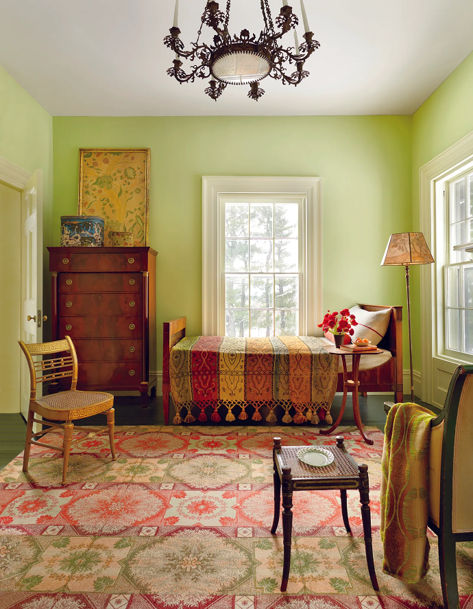 Burgundy surfaces in intimate zones—an upholstered armchair, a lacquered console, a curated art wall. Pistachio appears even more discreetly: a border on a custom rug, a subtle trim detail, a carefully chosen object.
